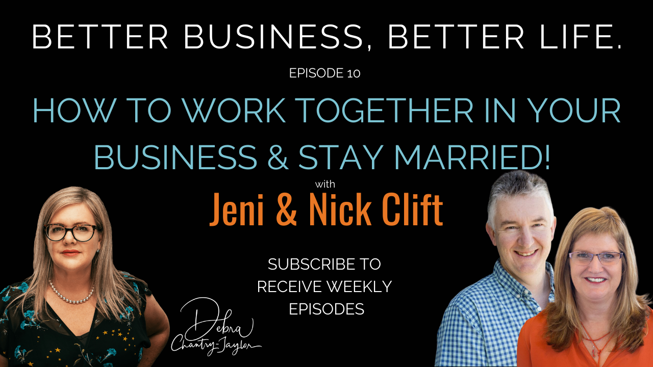 So welcome to another episode of better business, better life. My name is Debra Chantry-Taylor. And I’m here today with Nick and Jeni Clift. And Nick and Jeni have been working together for 25 years and they’re here to talk to us about how you get to work together and still stay married. So welcome, Nick and Jeni, thank you for coming on board.