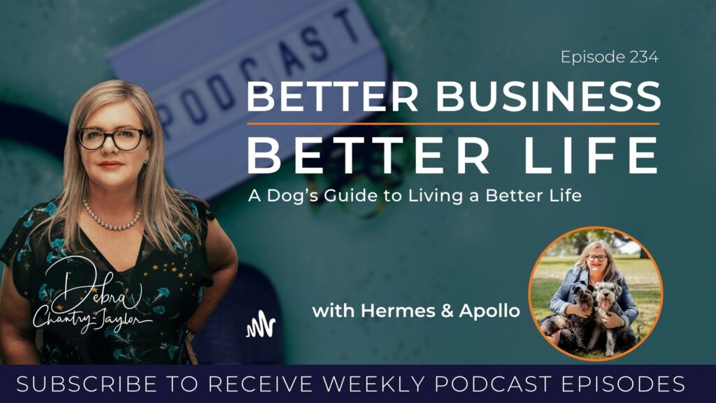 Hi and welcome to a extra special episode of Better Business, better life. I’m joined by my two wonderful dogs, Hermes and Apollo, and we’re going to find out what we as humans can actually learn from them as dogs. Let’s start with you, Hermes, you seem to have a worried look on your face. What’s going on? I do get worried. Sometimes. I worry about whether Mummy will come home, like when you left us at home the other day. Now, Hermes, mummy always comes home, you need to keep your thoughts more positive and stay in the moment. Think about it. I think I think too much. That’s my problem. You do think too much. Emmys every morning we go on the same walk, the same route, the same interesting things to see. It’s true. I love Walks. Hey, guys, focus. Sorry, right? That’s being in the moment, and I think humans should do this more often. Imagine if they got as excited as we do going to work every day or seeing the same people or peeing on No, no, no, no, Hermes, that’s just you. But I agree. I really enjoy the journey. It’s like when we travel in the car, ooh, car trip. Isn’t that exciting? We get to stick our heads out the windows and feel the wind. So what you’re saying, if I’ve got this right, is that we should live more in the moment, enjoy the journey, and not be quite so attached to the outcome.