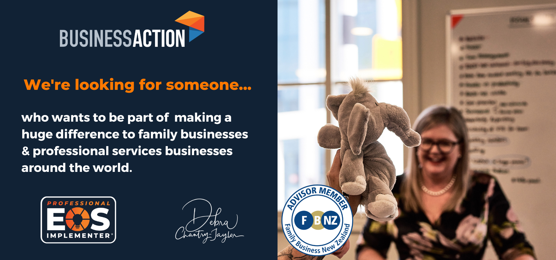 Debra, the founder of Business Action, is an EOS (Entrepreneurial Operating System) Implementer. She is looking for a right-hand person.